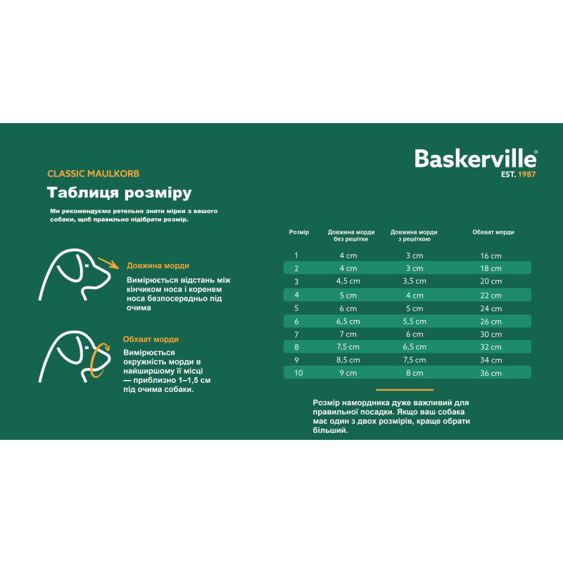 Універсальний намордник для собак з індивідуальним термоформуванням Baskerville Classic Muzzle – це поєднання комфорту улюбленця та сучасного дизайну. Намордник для собак Classic Muzzle виготовлений із легкого, але надзвичайно міцного пластику, який зберігає форму навіть при активному використанні, не натираючи та не сковуючи рухів собаки. Форма намордника для собак Classic Muzzle нагадує делікатно сплетену корзинку - м’які округлі ліні ідеально повторюють контур морди чотирилапого. Ключові переваги намордника для собак Baskerville Classic Muzzle:  Безпека - намордник не дозволяє підіймати з землі небезпечні предмети та унеможливлює покуси.  Індивідуальне термоформування під морду собаки  Комфорт – намордник не здавлює морду та не натирає шкіру завдяки анатомічній формі.  Вентиляція - корзинчаста форма забезпечує добру циркуляцію повітря.  Легкість матеріалу – намордник не обтяжує голову, підходить для тривалого носіння.  Міцність і гнучкість - намордник витримує удари під час активних ігор та не ламається.  Морозостійкість - намордник не тріскається на холоді та не примерзає до морди.  Гіпоалергенність - намордник безпечний для шкір та не викликає подразнень.  Універсальність – намордник підходить для дресирування, подорожей, виставок, тощо. Розмірна сітка наморднику для собак Baskerville Classic Muzzle: Розмір 1: Обхват морди 18 см, Довжина морди 4 см Розмір 2: Обхват морди 20 см, Довжина морди 4 см Розмір 3: Обхват морди 21 см, Довжина морди 5 см Розмір 4: Обхват морди 22 см, Довжина морди 5 см Розмір 5: Обхват морди 26 см, Довжина морди 6 см Розмір 6: Обхват морди 28 см, Довжина морди 7 см Розмір 7: Обхват морди 30 см, Довжина морди 7 см Розмір 8: Обхват морди 32 см, Довжина морди 7,5 см Розмір 9: Обхват морди 34 см, Довжина морди 9 см Розмір 10: Обхват морди 36 см, Довжина морди 9 см Розмір 12: Обхват морди 35,5 см, Довжина морди 6 см Розмір 13: Обхват морди 38 см, Довжина морди 4,5 см Для правильного вибору намордника необхідно чітко зняти мірки с улюбленця. Для цього потрібна м’яка сантиметрова стрічка, під час заміру звертайте увагу щоб стрічка прилягала щільно, але не тиснула. Собака має бути спокійним під час зняття мірок. Якщо зняті мірки «на межі» - обирайте більший розмір. 1. Обхват морди (ОМ): виміряйте окружність морди в найширшому її місці — приблизно 1–1,5 см під очима собаки. 2. Довжина морди (ДМ): виміряйте від кінчика носа до основи (міжочна зона де морда переходить у лоб). До отриманого результату додайте +1 см. Важливо: для пласкокомордих порід (мопси, бульдоги) потрібні спеціальні моделі намордника для собак.