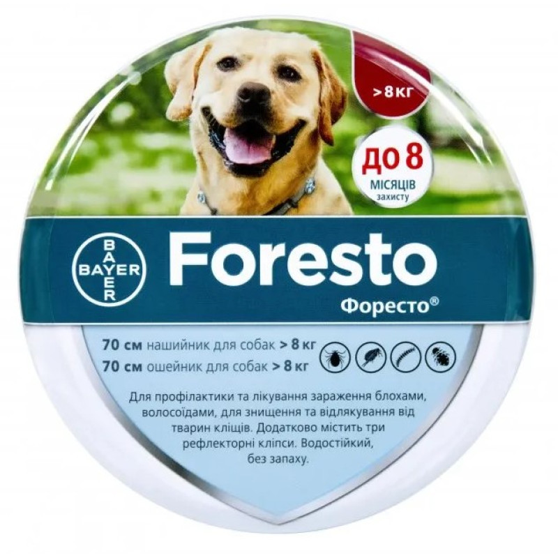 Bayer Foresto Dogs Протипаразитарний нашийник для собак вагою від 8 кг від бліх, кліщів та волосоїдів Форесто