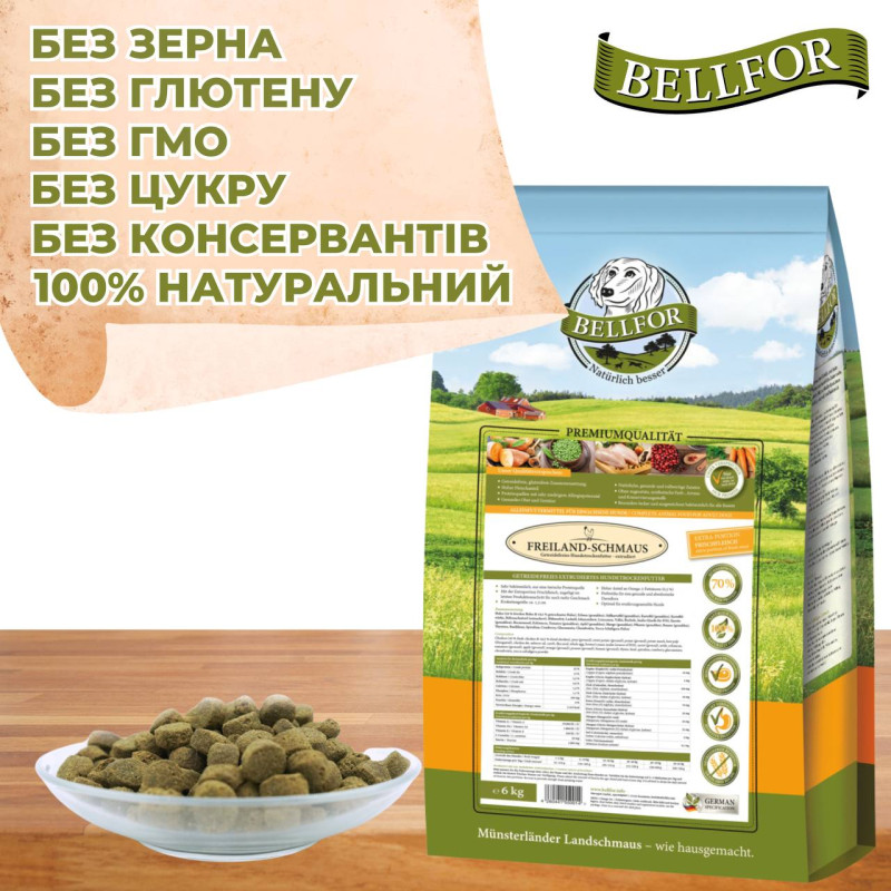 Крафтовий німецький холістик з куркою Bellfor Freiland Schmaus – це високоякісний беззерновий екструдований корм з крокетою