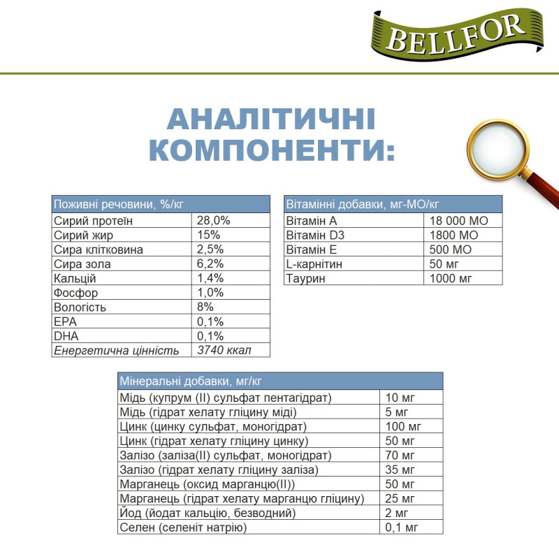 Унікальні інгредієнти у складі монопротеїнового корму холодного віджиму з глюкозаміном та хондроїтином Bellfor Wiesen-Schmaus Junior не тільки забезпечують організм цуценя життєво-необхідними компонентами, а й запобігають розвиненню поширених хвороб кісток, суглобів та зв’язок у дорослому віці. Крафтовий корм Bellfor Wiesen-Schmaus Junior необхідний у якості щоденного раціону цуценят великих порід, тому що організм масивних цуценят і юніорів не встигає виробляти природний глюкозамін і хондроїтин у таких кількостях, які потрібні для росту і формування здорових суглобів.