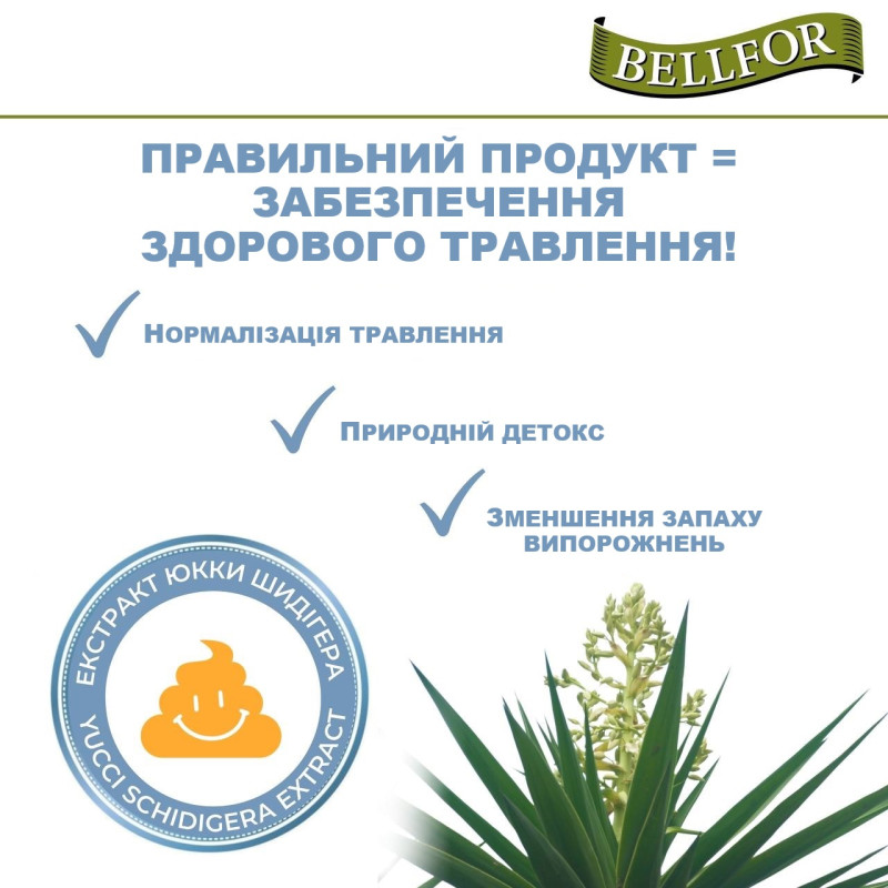 Юкка Шидігера – природній регулятор роботи травної та сечостатевої систем цуценят завдяки комплексу вітамінів, мінералів та ферментів, що зв’язують уреазу та ефективно долають шкідливі бактерії та токсини. Регулярне вживання екстракту очищує організм собаки від токсинів, зменшуючи неприємний запах від продуктів життєдіяльності, нормалізує та стимулює травлення, сприяючи швидшому всмоктуванню поживних речових, знижує рівень цукру у крові, зменшуючи ризик виникнення цукрового діабету, посилює імунітет, відновлює функції печінки, а також діє у якості допоміжної терапії при вроджених захворюваннях опорно-рухового апарату цуценят.
