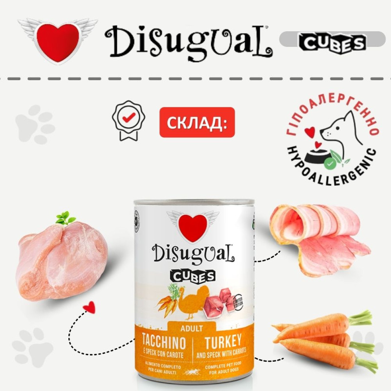 Disugual Dog Cubes 92% Adult Turkey, Speck & Carrots Безглютенова консерва для собак Індичка з Беконом та Морквою