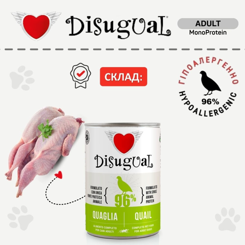 Disugual Dog MonoProtein 96% Quail Монопротеїновий консервований беззерновий корм для собак Паштет з Перепілки – це високоякісний натуральний вологий безглютеновий корм для собак класу холістик від італійського бренду Disugual, відомого виробника високоякісного натурального харчування для собак та котів без додавання штучних ароматизаторів, консервантів та інших хімічних речовин.