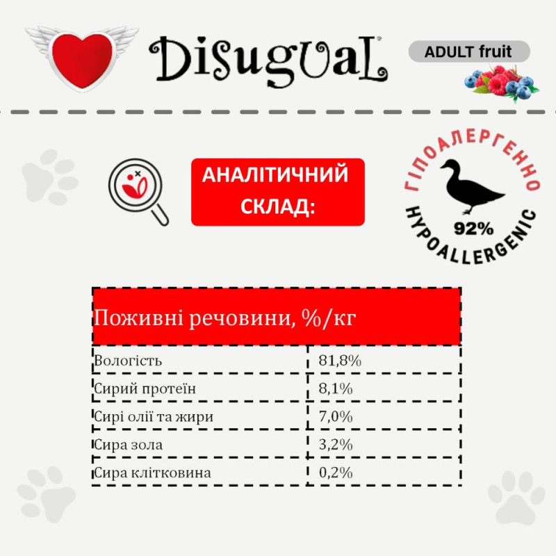 Лінійка вологого безглютенового корму для собак Disugual Adult Dog Fruit 92% - це натуральна їжа для собак будь-яких порід, що виготовлена з добірної сировини й на 92% складається з натурального м’яса або риби та на 4% з вишуканих фруктів або ягід, не містить ароматизаторів, штучних добавок та підсилювачів смаку.