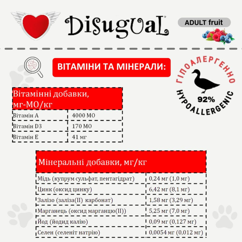 Склад беззернового гіпоалергенного корму для собак Disugual Dog MonoProtein Fruit 92% Duck & Kiwi: качка 92%, ківі 4%, мінеральні речовини, ксилоза.
