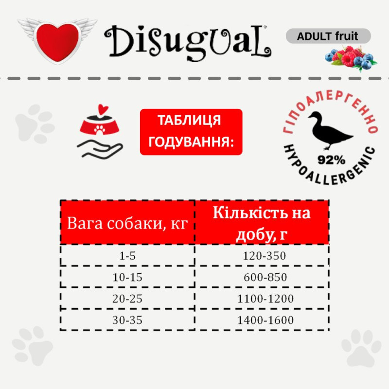 • ·         Монопротеїн – монопротеїновий корм для собак Disugual Dog MonoProtein Fruit 92% Duck & Kiwi містить лише одне джерело високоякісного білку тваринного походження – добірну качку. Монопротеїновий корм для собак знижує ризик алергії та є основою для елімінаційної дієти, яка допомагає виявити, які продукти викликають негативну реакцію у собаки.