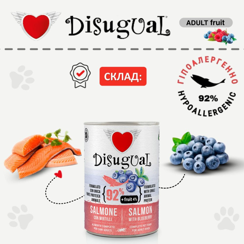Disugual Dog MonoProtein Fruit 92% Salmon & Blueberry Монопротеїнова беззернова консерва для собак Паштет з Лосося та Чорниці