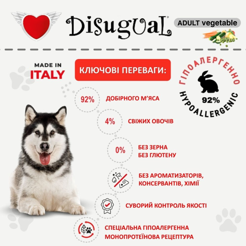 Спеціальна італійська рецептура монопротеїнового корму для собак Disugual Dog MonoProtein Vegetable 92% Rabbit & Courgettes без глютену та зерна на основі добірного м'яса кролика з кабачком, вітамінно-мінеральним комплексом та природнім пребіотиком ідеально підходить як повнораційний корм для собак з харчовою непереносимістю, харчовою алергією у собак, непереносимістю глютену у собак, ожиріння у собак.