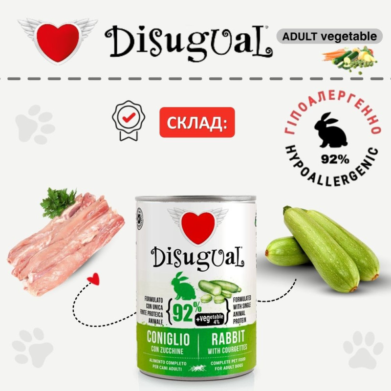 Disugual Dog MonoProtein Vegetable 92% Rabbit & Courgettes Монопротеїнова беззернова консерва для собак Паштет з Кролика та Кабачка – це високоякісний натуральний вологий безглютеновий корм для собак класу холістик від італійського бренду Disugual, відомого виробника високоякісного натурального харчування для собак та котів без додавання штучних ароматизаторів, консервантів та інших хімічних речовин.
