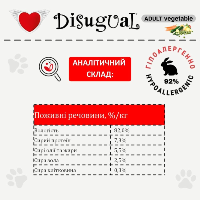 Лінійка вологого безглютенового корму для собак Disugual Adult Dog Vegetable 92% - це натуральна їжа для собак будь-яких порід, що виготовлена з добірної сировини й на 92% складається з натурального м’яса або риби та на 4% зі свіжих овочів, не містить ароматизаторів, штучних добавок та підсилювачів смаку.