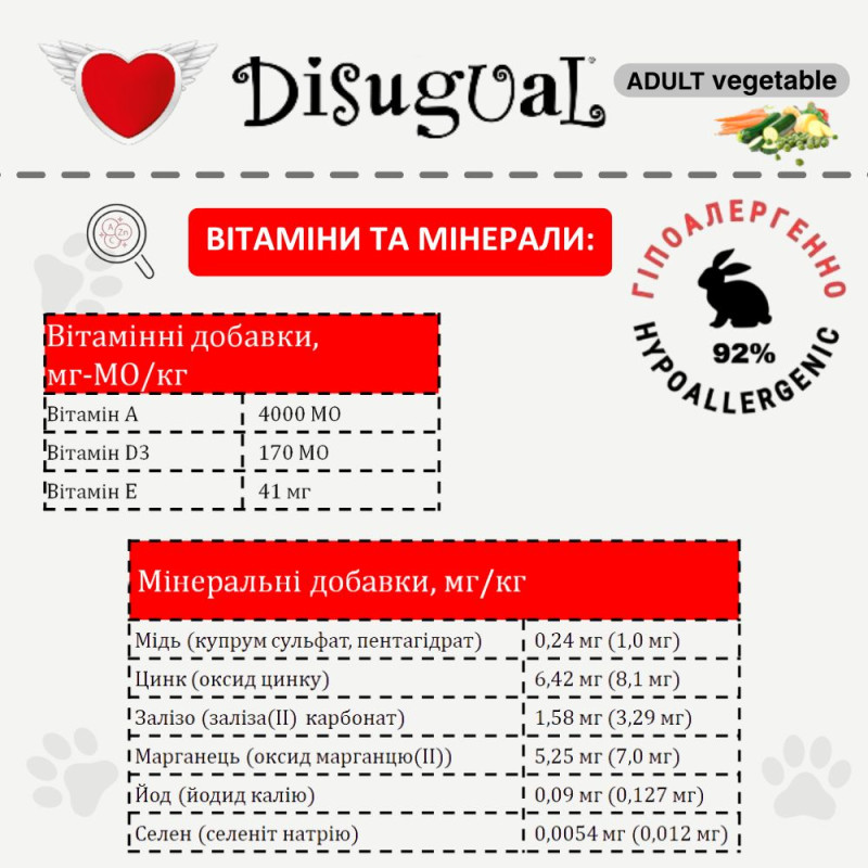 Склад беззернового гіпоалергенного корму для собак Disugual Dog MonoProtein Vegetable 92% Rabbit & Courgettes: кролик (м'ясо) 92%, кабачок 4%, мінеральні речовини, ксилоза.