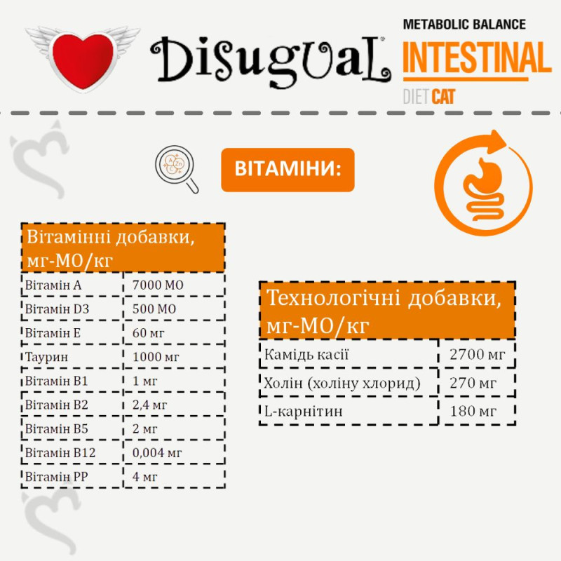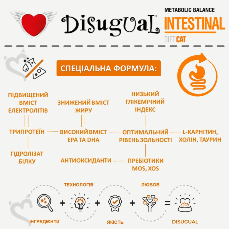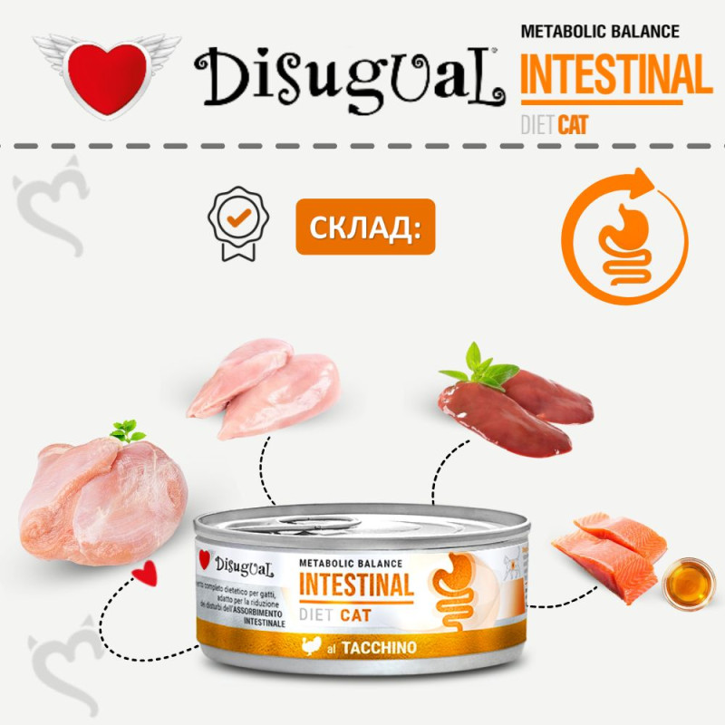 Лінійка вологого безглютенового лікувального корму для котів Disugual Metabolic Balance Diet Cat Intestinal – це спеціалізована лікувальна консерва для котів з розладами травлення. Завдяки високому вмісту легкозасвоюваних речовин, м’якій текстурі та гіпоалергенним інгредієнтам, лікувальний корм легко засвоюється та підходить навіть для ослаблених котів та котів з непереносимістю. Disugual Metabolic Balance Diet Cat Intestinal складається з декількох видів натурального м’яса, не містить ароматизаторів, штучних добавок та підсилювачів смаку. Протеїновий інтестінал корм для котів -  це збалансований раціон з легкозасвоюваними інгредієнтами у мінімальній кількості для зменшення непереносимості та високою концентрацією електролітів для швидкого відновлення водного балансу та підтримки функціонування шлунково-кишкового тракту під час гострих розладів травлення, діареї або після них.