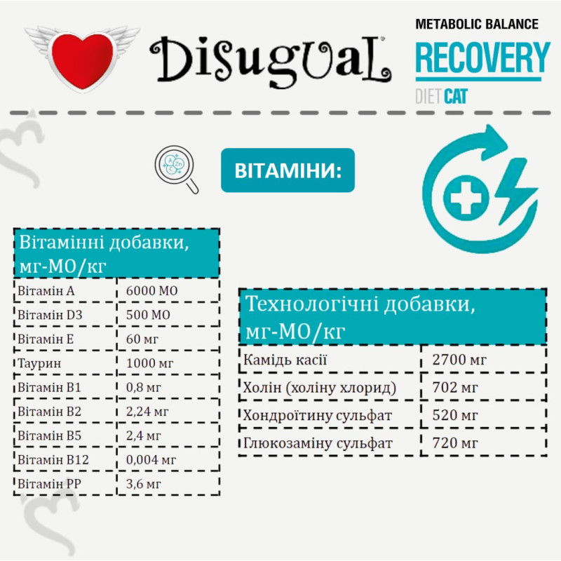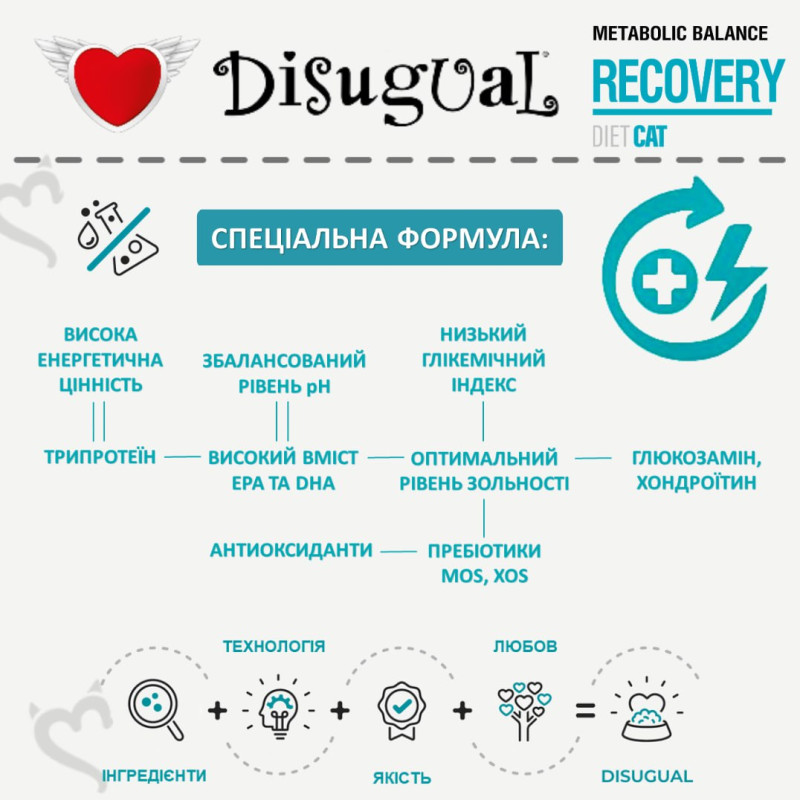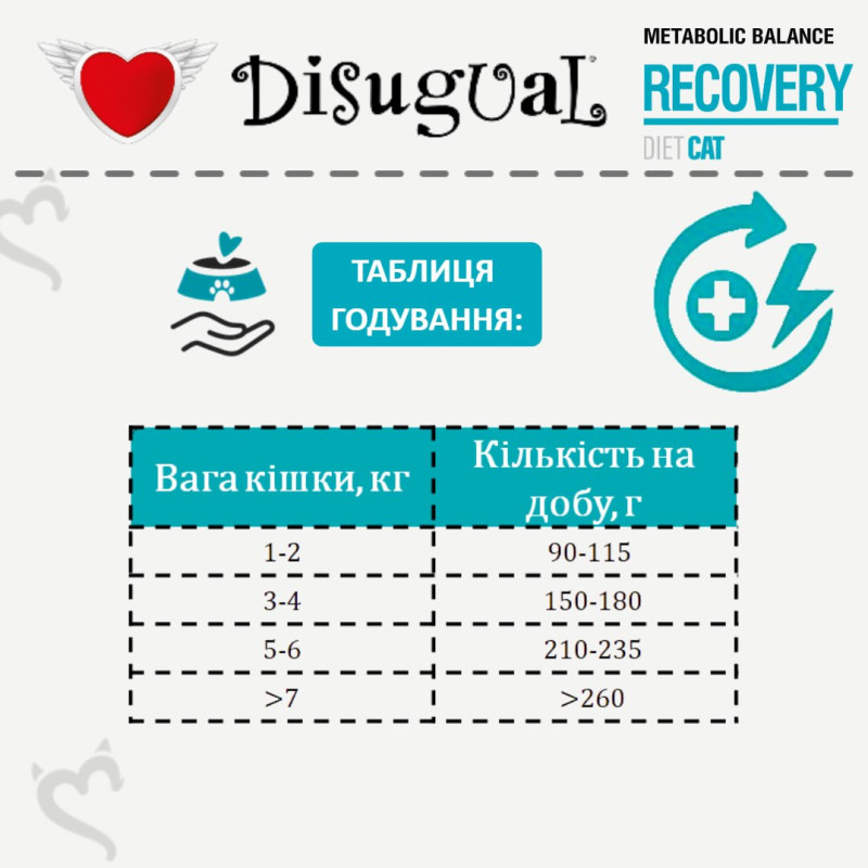 Лінійка вологого безглютенового лікувального корму для котів Disugual Metabolic Balance Diet Cat Recovery – це спеціалізована лікувальна консерва для котів, що розроблена для підтримки організму тварини під час відновлення після хвороби, операції або виснаження. Завдяки високому вмісту поживних речовин і м’якій текстурі, корм легко засвоюється та підходить навіть для ослаблених або вибагливих котів. Disugual Metabolic Balance Diet Cat Recovery складається з трьох видів натурального м’яса, не містить ароматизаторів, штучних добавок та підсилювачів смаку. Трипротеїновий рекавері корм для котів -  це збалансований енергетичний раціон з легкозасвоюваними інгредієнтами та високою концентрацією поживних речовин, необхідних коту під час фази одужання.