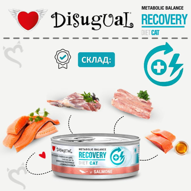 Disugual Metabolic Balance Diet Cat Recovery Salmon Вологий лікувальний корм для котів в період відновлення Паштет з Лосося – це високоякісний натуральний вологий безглютеновий лікувальний корм для котів класу холістик від італійського бренду Disugual, відомого виробника високоякісного натурального харчування для собак та котів без додавання штучних ароматизаторів, консервантів та інших хімічних речовин.