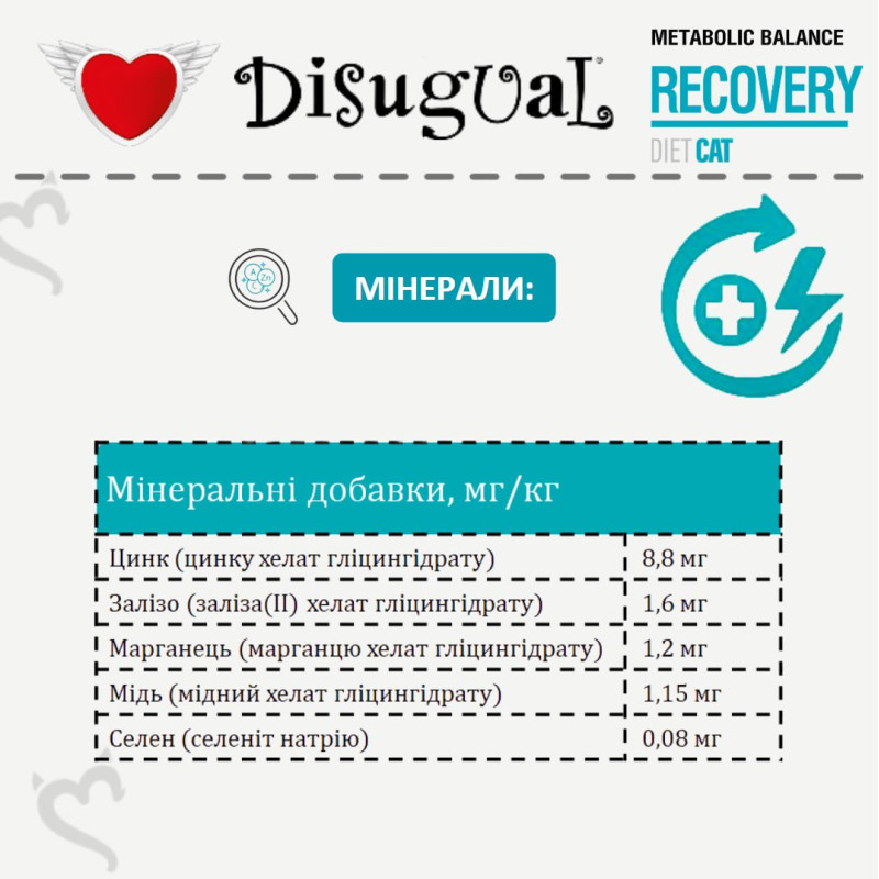 Склад лікувального корму рекавері для котів Disugual Metabolic Balance Diet Cat Recovery Salmon: лосось 30%, кролик (м'ясо), баранина (м'ясо), лососева олія, мінеральні речовини, MOS, XOS, поліфеноли винограду, ксилоза.
