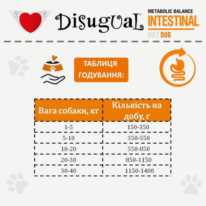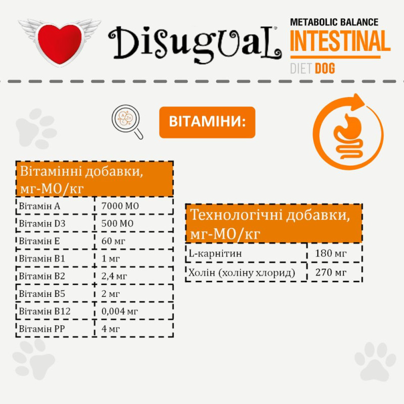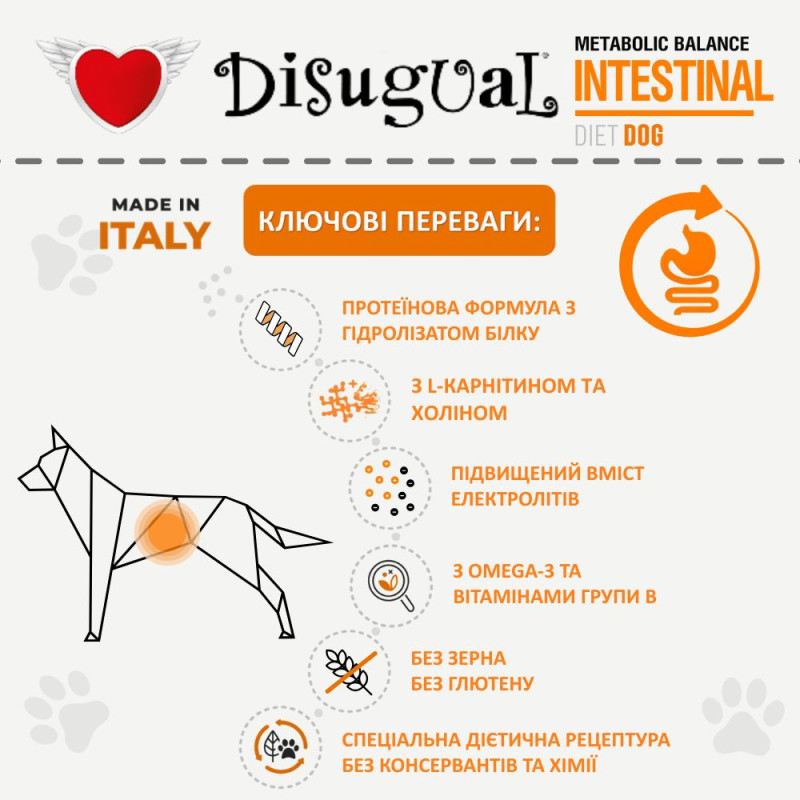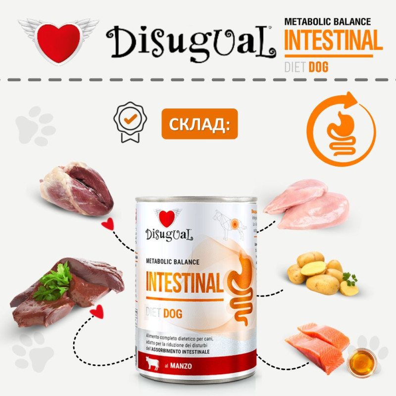 Лінійка вологого безглютенового лікувального корму для собак Disugual Metabolic Balance Diet Dog Intestinal – це спеціалізована лікувальна консерва для собак з розладами травлення. Завдяки високому вмісту легкозасвоюваних речовин, м’якій текстурі та гіпоалергенним інгредієнтам, лікувальний корм легко засвоюється та підходить навіть для ослаблених собак та собак з непереносимістю. Disugual Metabolic Balance Diet Dog Intestinal складається з одного-двох видів натурального м’яса, не містить ароматизаторів, штучних добавок та підсилювачів смаку. Протеїновий інтестінал корм для собак - це збалансований раціон з легкозасвоюваними інгредієнтами у мінімальній кількості для зменшення непереносимості та високою концентрацією електролітів для швидкого відновлення водного балансу та підтримки функціонування шлунково-кишкового тракту під час гострих розладів травлення, діареї або після них.