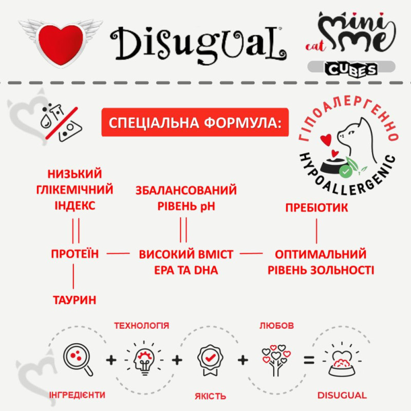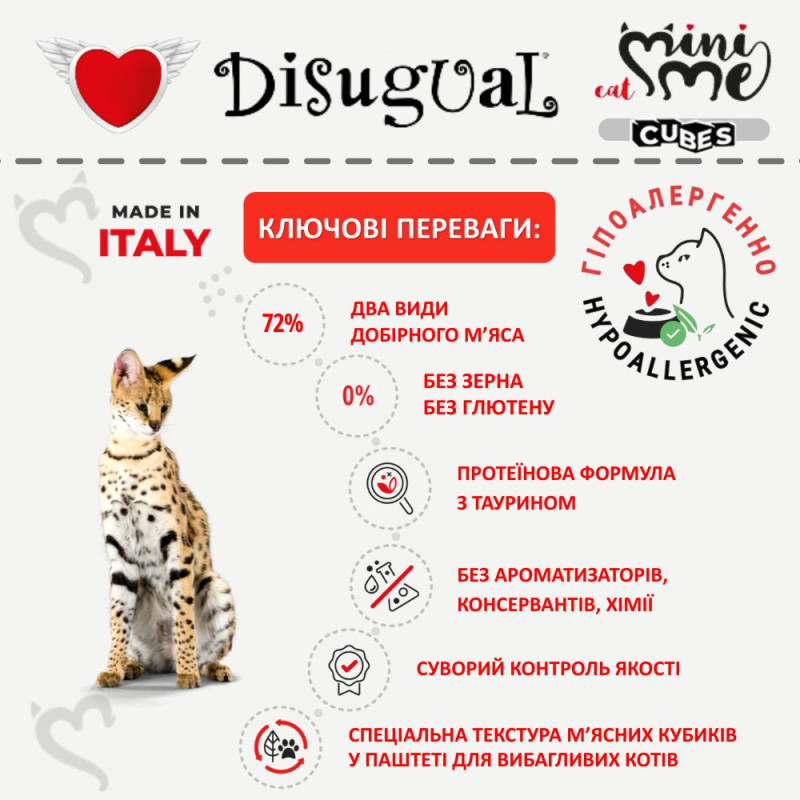 безглютенового корму для котів Disugual Mini Me Cubes Cat 72% - це вишукані шматочки добірного м’яса у соковитому