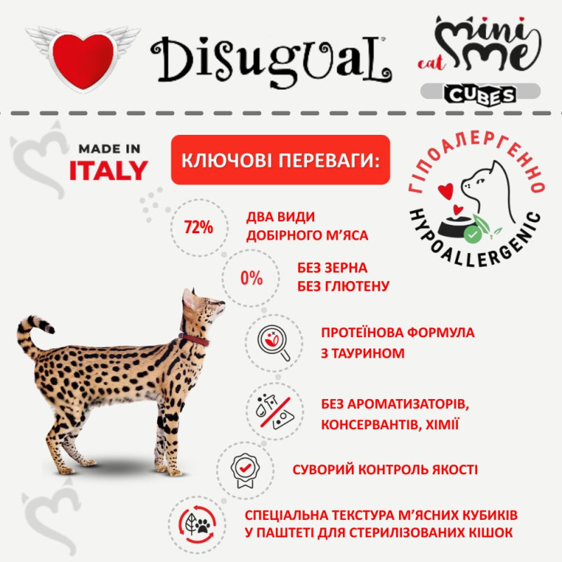 безглютенового корму для стерилізованих кішок та кастрованих котів Disugual Mini Me Cubes Sterilized Cat 72%- це вишукані шматочки добірного м’яса у соковитому