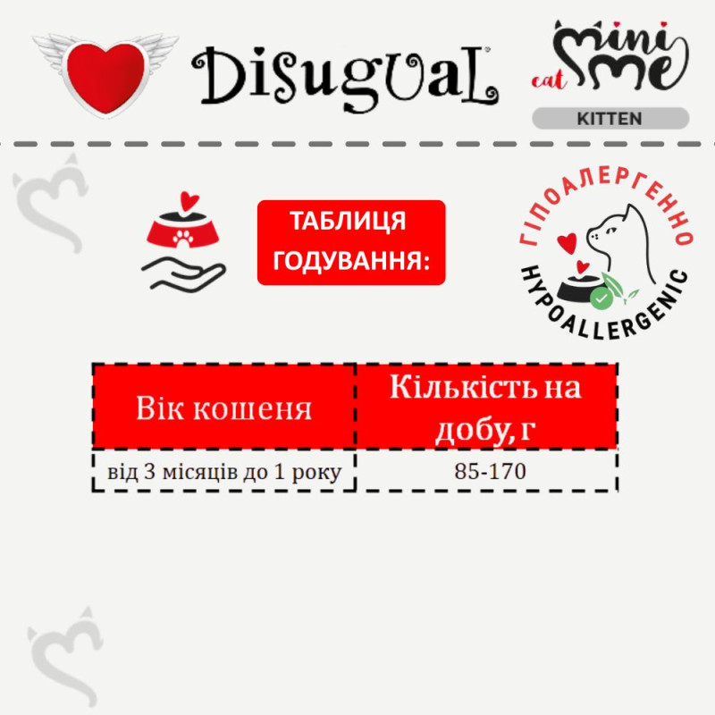 Спеціальна італійська рецептура протеїнового корму для кошенят Disugual Mini Me Kitten 96% Protein без глютену на основі трьох видів добірного м’яса з вітамінно-мінеральним комплексом, таурином та природнім пребіотиком ідеально підходить як повнораційний корм для кошенят з харчовою непереносимістю, харчовою алергією у кошенят та непереносимістю глютену у кошенят. Ніжна текстура паштету створена з особливою турботою про чутливе травлення кошенят.