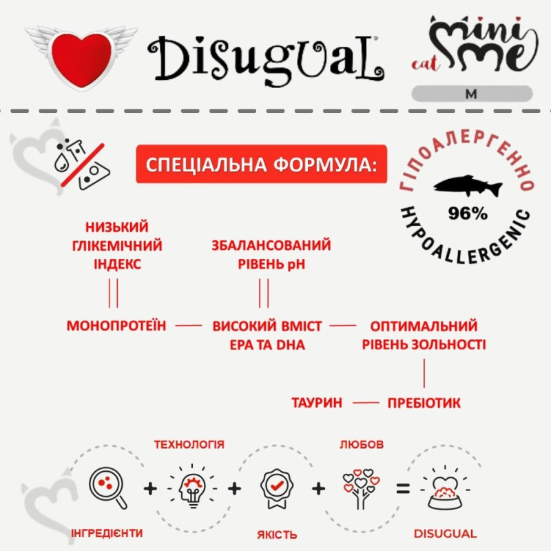 Лінійка вологого безглютенового корму для котів Disugual Mini Me MonoProtein Cat 96% - це натуральна їжа для котів будь-яких порід, що виготовлена з добірної сировини й на 96% складається з натурального мяса або риби, як єдиного джерела тваринного білку, не містить ароматизаторів, штучних добавок та підсилювачів смаку.