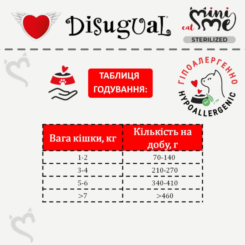 Спеціальна італійська рецептура протеїнового корму для стерилізованих кішок та кастрованих котів Disugual Mini Me Sterilised Cat 96% Protein Chicken без глютену та зерна на основі трьох видів добірного мяса з вітамінно-мінеральним комплексом, таурином та природнім пребіотиком ідеально підходить як повнораційний корм для стерилізованих кішок та кастрованих котів з харчовою непереносимістю, харчовою алергією у котів, непереносимістю глютену у котів, ожиріння у котів, активних та вибагливих котів.
