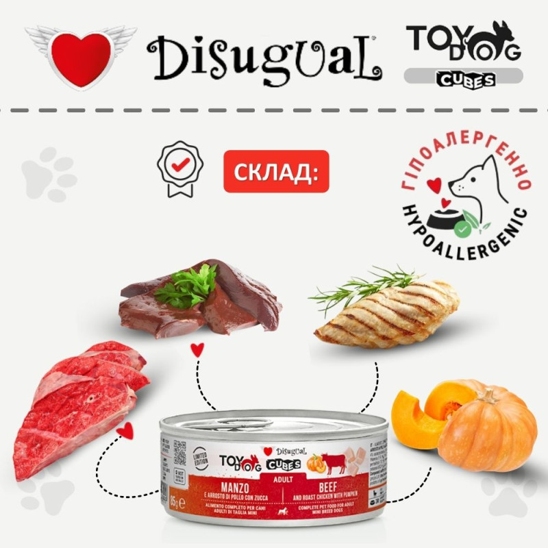 Disugual TOYDog Cubes 92% Adult Beef, Roast Chicken & Pumpkin Безглютенова консерва для собак маленьких порід Яловичина з Запеченою Куркою та Гарбузом