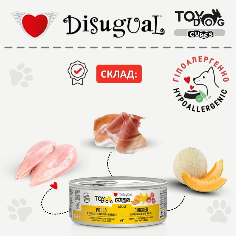 Disugual TOYDog Cubes 92% Adult Chicken, Raw Ham & Melon Безглютенова консерва для собак маленьких порід Курка з Прошутто та Динею