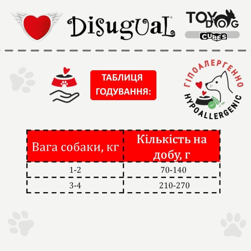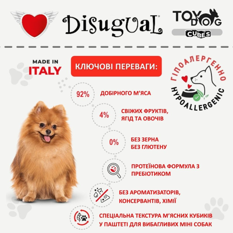 безглютенового корму для маленьких собак Disugual TOYDog Cubes 92% - це вишукані шматочки добірного м’яса у соковитому