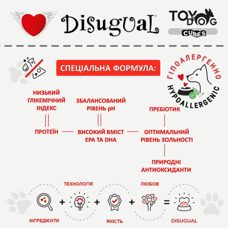 Лінійка вологого безглютенового корму для маленьких собак Disugual TOYDog Cubes 92% - це вишукані шматочки добірного м’яса у соковитому ніжному паштеті, натуральна їжа для собак маленьких порід, що виготовлена з добірної сировини й на 92% складається з натурального м’яса або риби та на 4% зі свіжих фруктів, овочів або ягід, не містить ароматизаторів, штучних добавок та підсилювачів смаку. Лінійка вологого корму для маленьких собак Disugual TOYDog Cubes 92% розроблена з урахуванням їхніх фізіологічних особливостей, потреб у високоякісному харчуванні та зручності споживання.