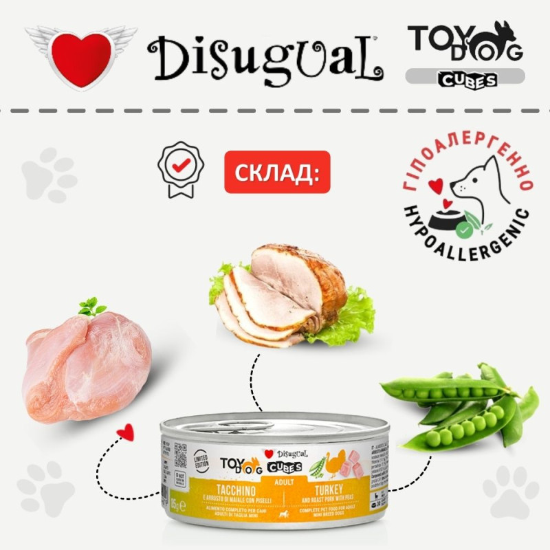 Disugual TOYDog Cubes 92% Adult Turkey, Roast & Peas Безглютенова консерва для собак маленьких порід Індичка з Запеченою Свининою та Горошком