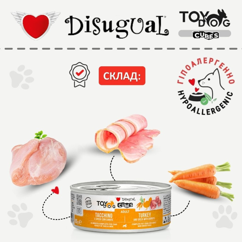 Безглютенова консерва для собак маленьких порід Індичка з Беконом та Морквою Disugual TOYDog Cubes 92% Adult Turkey, Speck & Carrots – це високоякісний натуральний вологий безглютеновий корм для маленьких собак класу холістик від італійського бренду Disugual, відомого виробника високоякісного натурального харчування для маленьких собак та котів без додавання штучних ароматизаторів, консервантів та інших хімічних речовин.