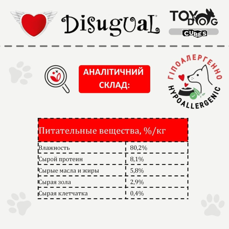 безглютенового корму для маленьких собак Disugual TOYDog Cubes 92% - це вишукані шматочки добірного м’яса у соковитому