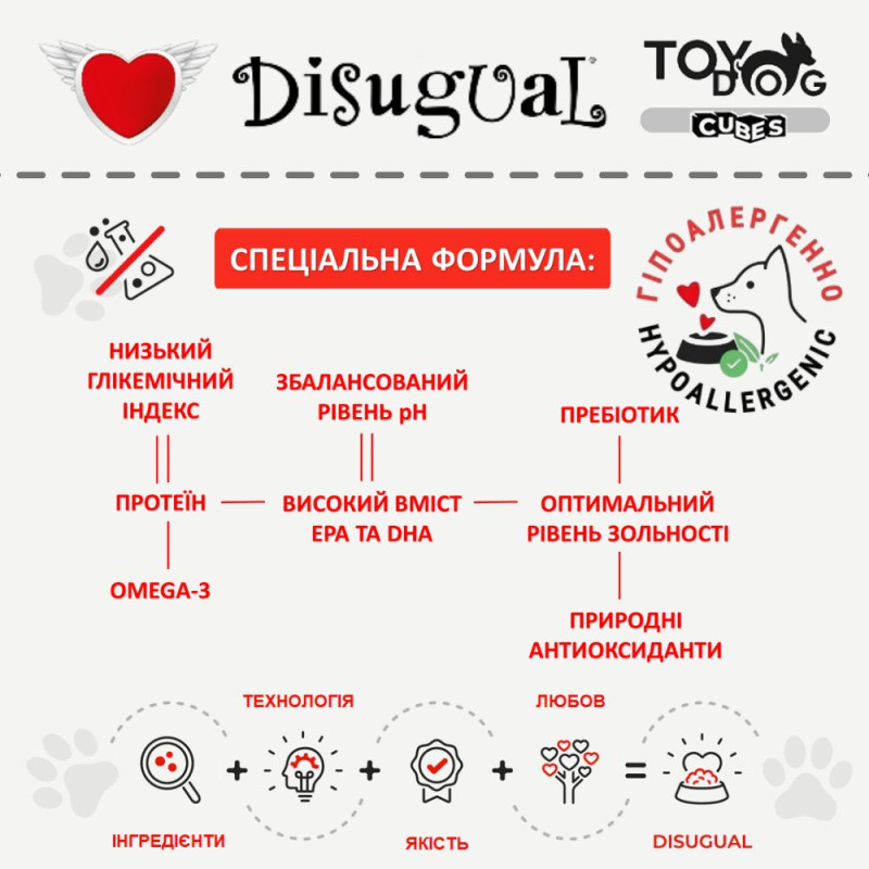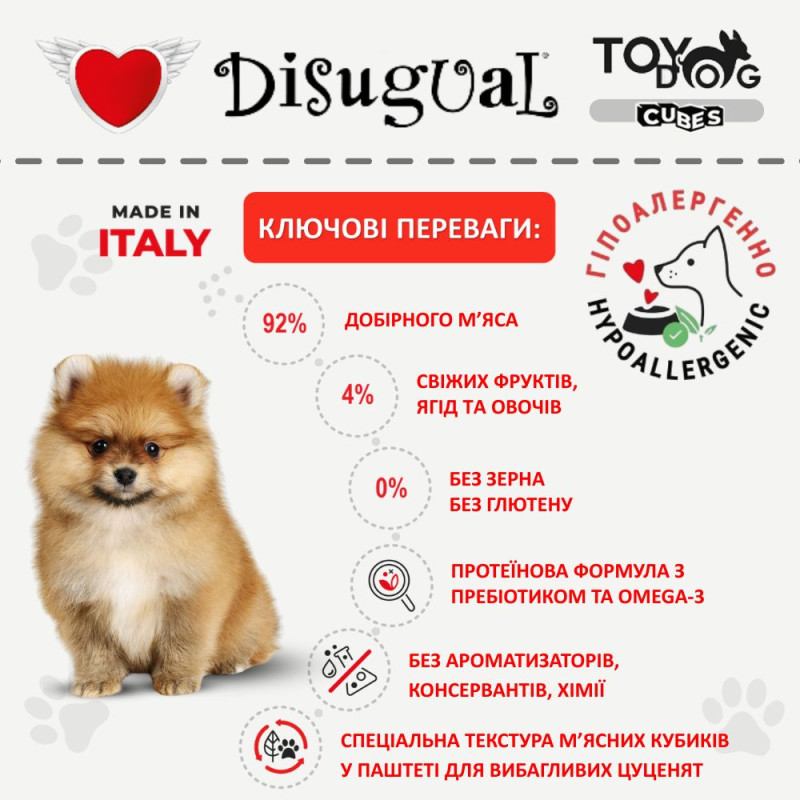 Ключові переваги вологого безглютенового протеїнового корму для цуценят Disugual TOYDog Cubes 92% Puppy Turkey, Cooked Ham & Rice: