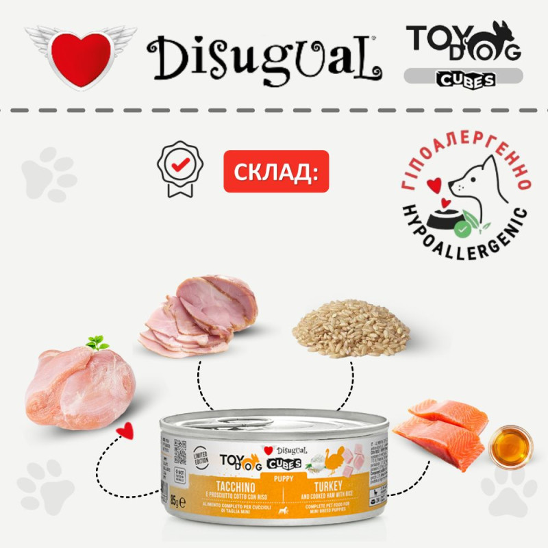 Безглютенова консерва для цуценят маленьких порід Індичка з Прошутто та Рисом Disugual TOYDog Cubes 92% Puppy Turkey, Cooked Ham & Rice – це високоякісний натуральний вологий безглютеновий корм для цуценят маленьких порід класу холістик від італійського бренду Disugual, відомого виробника високоякісного натурального харчування для маленьких собак та котів без додавання штучних ароматизаторів, консервантів та інших хімічних речовин.