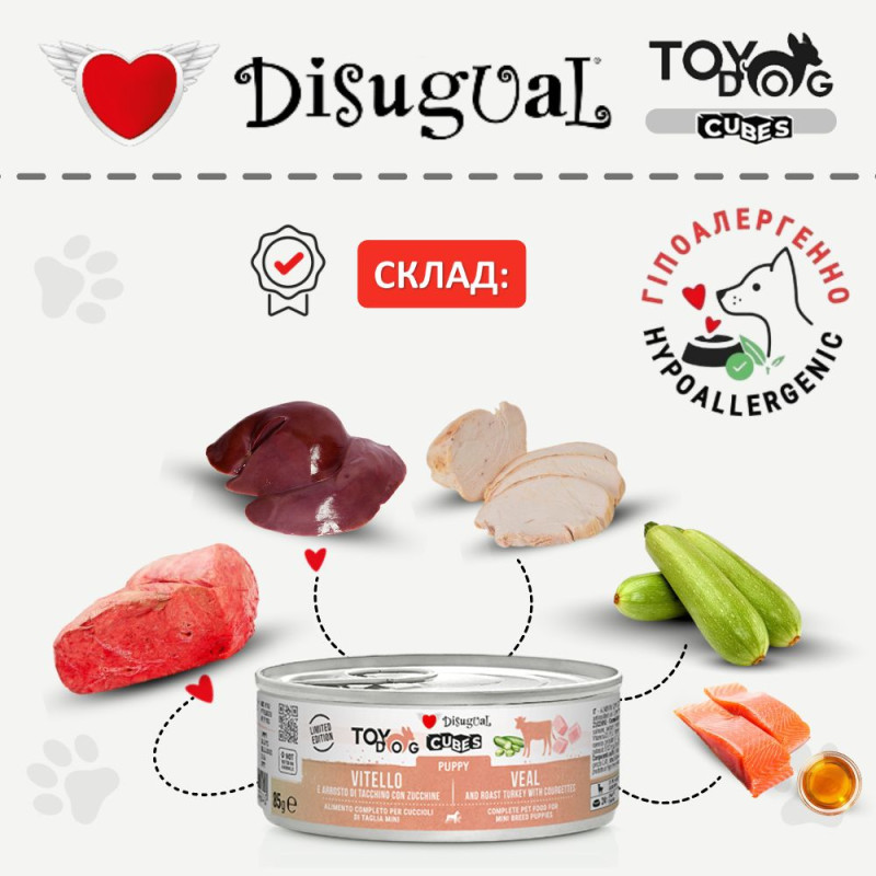 Безглютенова консерва для цуценят маленьких порід Телятина з Запеченою Індичкою та Кабачком Disugual TOYDog Cubes 92% Puppy Veal, Roast Turkey & Courgettes – це високоякісний натуральний вологий безглютеновий корм для цуценят класу холістик від італійського бренду Disugual, відомого виробника високоякісного натурального харчування для маленьких собак та котів без додавання штучних ароматизаторів, консервантів та інших хімічних речовин.