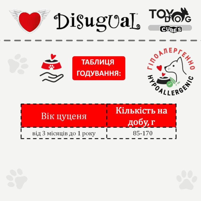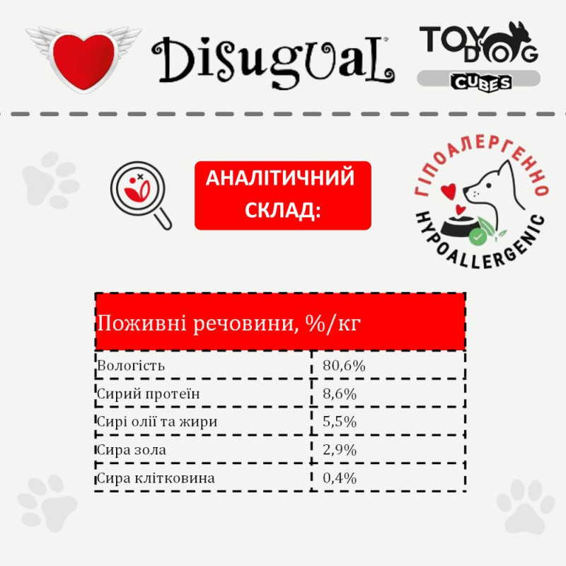 Ключові переваги вологого безглютенового протеїнового корму для цуценят Disugual TOYDog Cubes 92% Puppy Veal, Roast Turkey & Courgettes:
