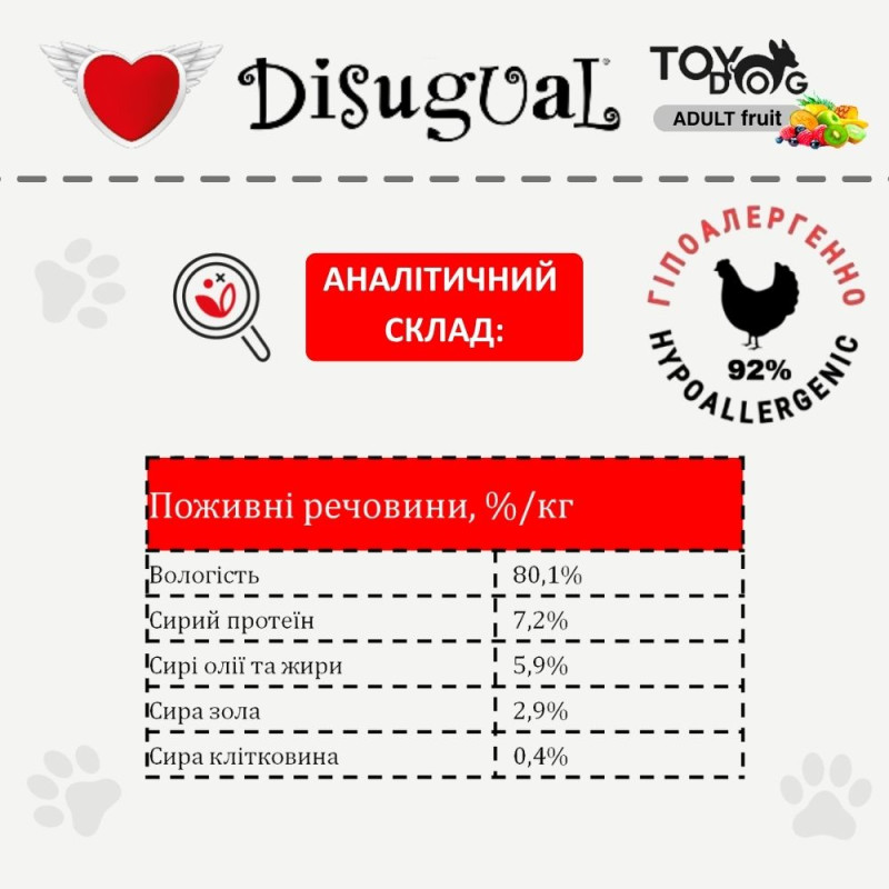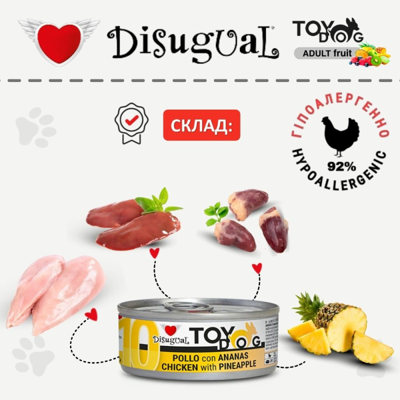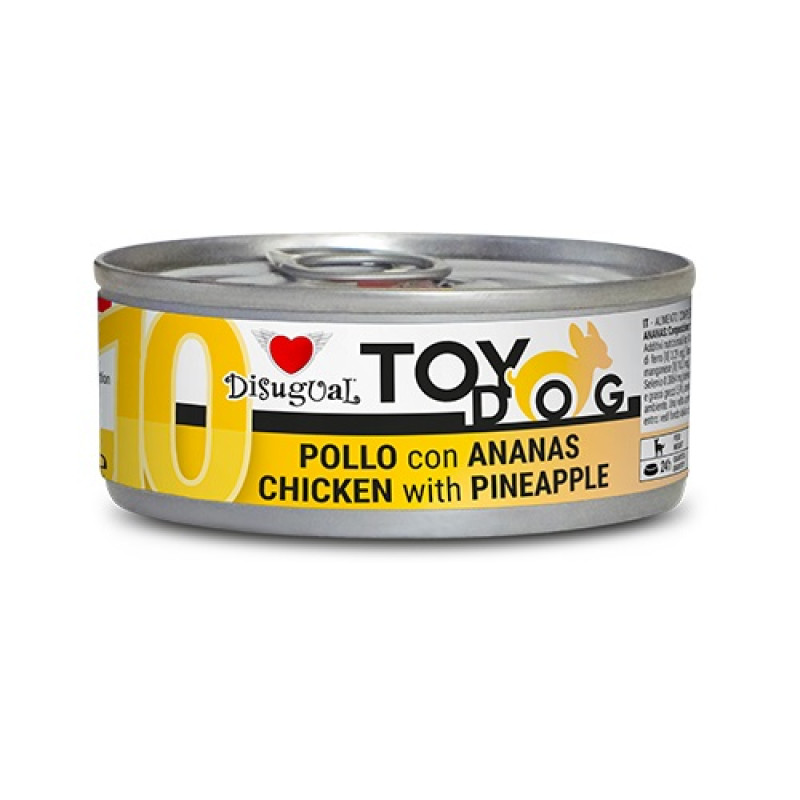 Disugual TOYDog MonoProtein 92% Chicken & Pineapple Беззернова консерва для собак маленьких порід Паштет з Курки та Ананаса – це високоякісний натуральний вологий безглютеновий корм класу холістик для собак маленьких порід від італійського бренду Disugual, відомого виробника високоякісного натурального харчування для собак та котів без додавання штучних ароматизаторів, консервантів та інших хімічних речовин.