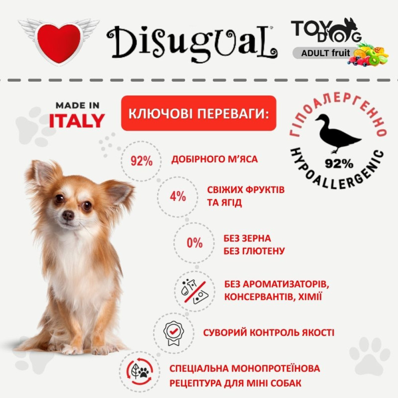 Спеціальна італійська рецептура монопротеїнового корму для собак маленьких порід Disugual TOYDog MonoProtein 92% Duck & Kiwi без глютену та зерна на основі добірної качки з ківі, вітамінно-мінеральним комплексом та природнім пребіотиком ідеально підходить як повнораційний корм для маленьких собак з харчовою непереносимістю, харчовою алергією у маленьких собак, непереносимістю глютену у собак, ожиріння у собак.