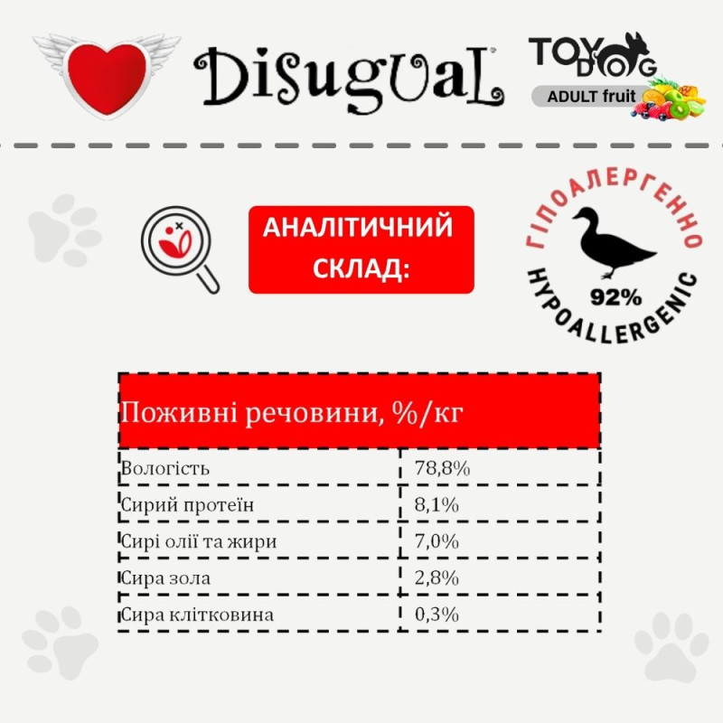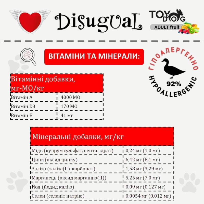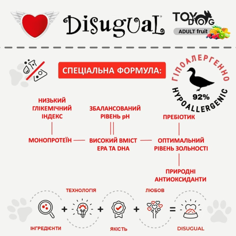 • ·         Монопротеїн – монопротеїновий корм для собак Disugual TOYDog MonoProtein 92% Duck & Kiwi містить лише одне джерело високоякісного білку тваринного походження – добірну качку. Монопротеїновий корм для собак знижує ризик алергії та є основою для елімінаційної дієти, яка допомагає виявити, які продукти викликають негативну реакцію у собаки.