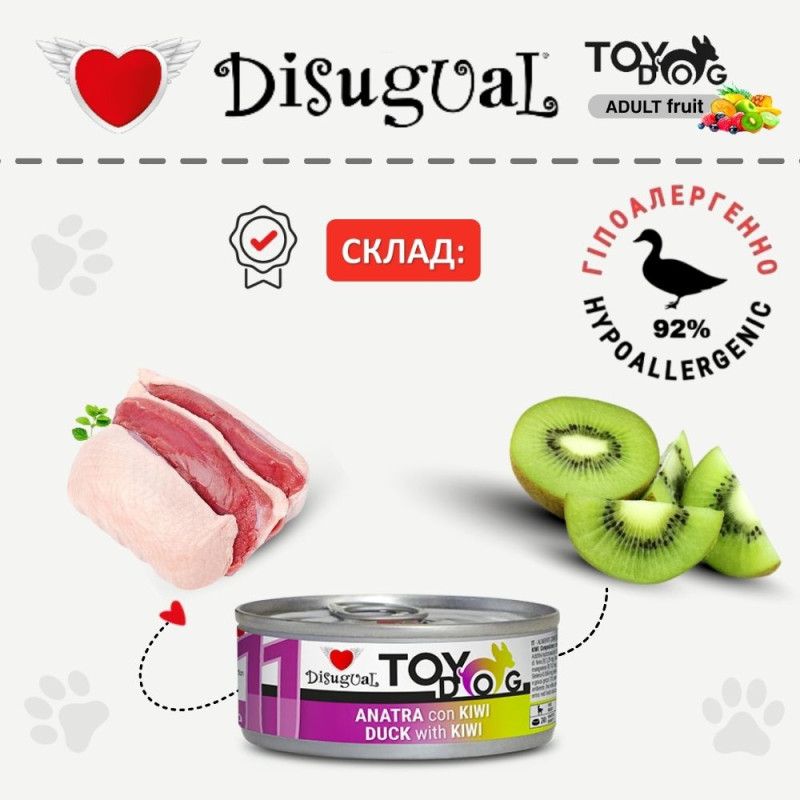 Disugual TOYDog MonoProtein 92% Duck & Kiwi Беззернова консерва для собак маленьких порід Паштет з Качки та Ківі – це високоякісний натуральний вологий безглютеновий корм класу холістик для собак маленьких порід від італійського бренду Disugual, відомого виробника високоякісного натурального харчування для собак та котів без додавання штучних ароматизаторів, консервантів та інших хімічних речовин.