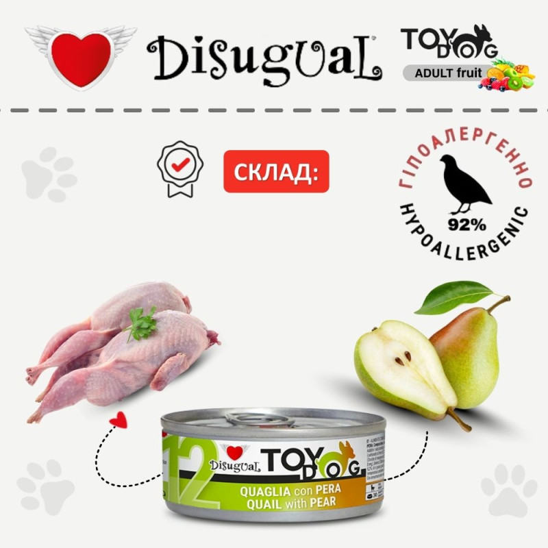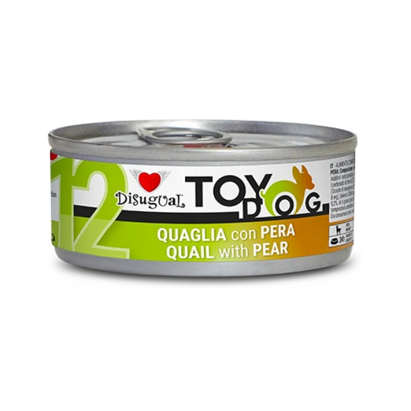 Disugual TOYDog MonoProtein 92% Quail & Pear Беззернова консерва для собак маленьких порід Паштет з Перепілки та Груші – це високоякісний натуральний вологий безглютеновий корм класу холістик для собак маленьких порід від італійського бренду Disugual, відомого виробника високоякісного натурального харчування для собак та котів без додавання штучних ароматизаторів, консервантів та інших хімічних речовин.
