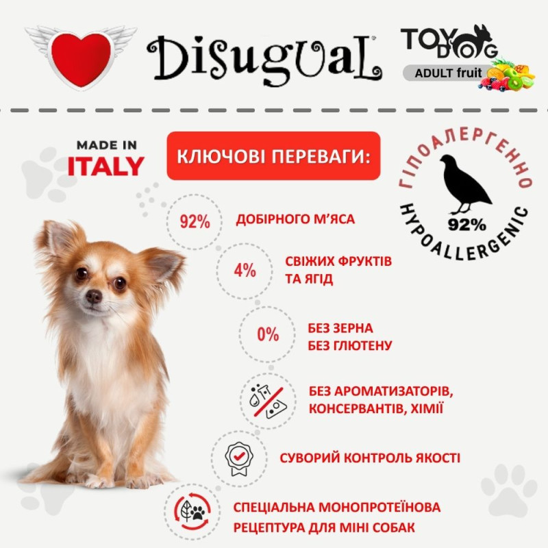 Спеціальна італійська рецептура монопротеїнового корму для собак маленьких порід Disugual TOYDog MonoProtein 92% Quail & Pear без глютену та зерна на основі добірної перепілки з грушею, вітамінно-мінеральним комплексом та природнім пребіотиком ідеально підходить як повнораційний корм для маленьких собак з харчовою непереносимістю, харчовою алергією у маленьких собак, непереносимістю глютену у собак, ожиріння у собак.