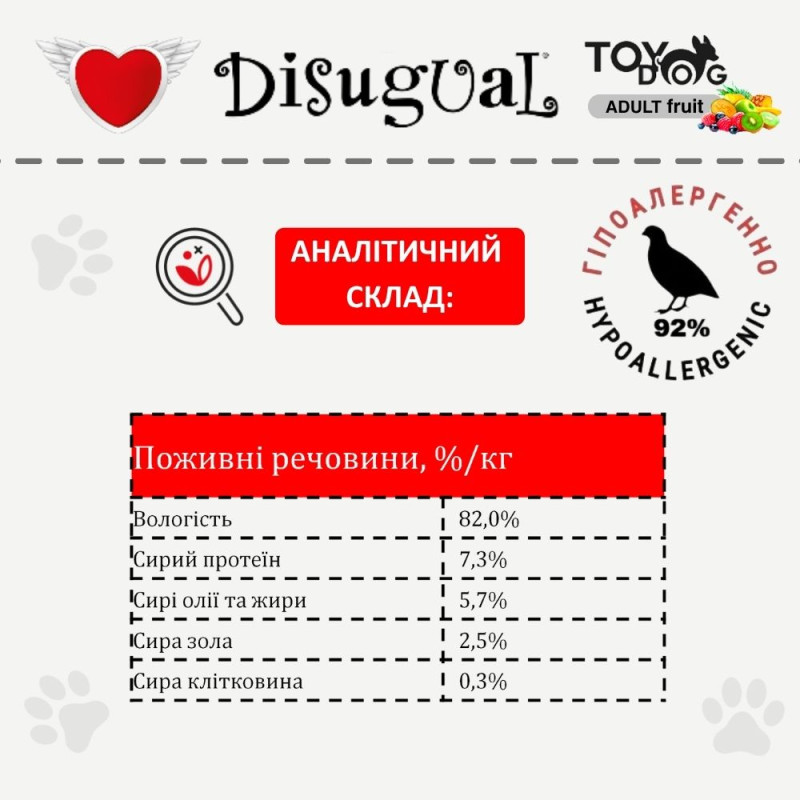 Лінійка вологого безглютенового корму для маленьких собак Disugual TOYDog MonoProtein 92% - це натуральна їжа для собак маленьких та мініатюрних порід, що виготовлена з добірної сировини й на 92% складається з натурального м’яса або риби та на 4% з вишуканих фруктів або ягід, не містить ароматизаторів, штучних добавок та підсилювачів смаку. Лінійка вологого корму для маленьких собак Disugual TOYDog розроблена з урахуванням їхніх фізіологічних особливостей, потреб у високоякісному харчуванні та зручності споживання.