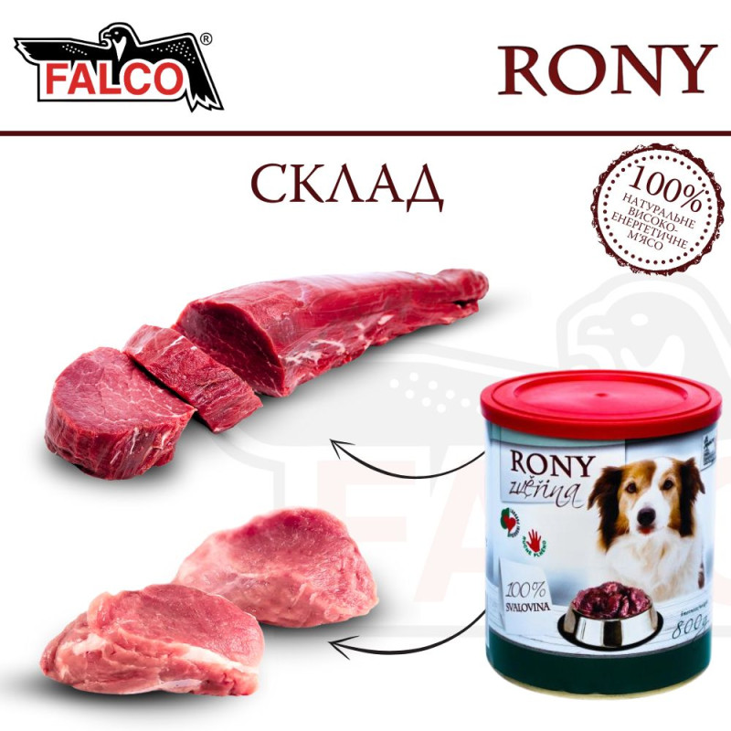 працюють на силу, витривалість і здоров’я. FALCO RONY Dog - це високоенергетичне легкозасвоюване м’ясо для собак,