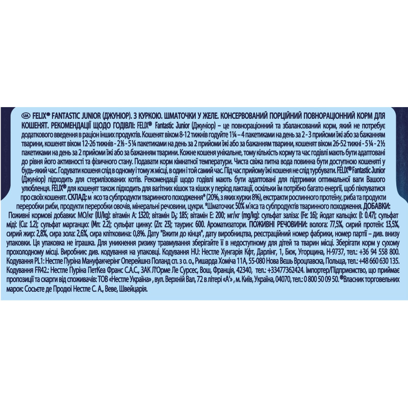 Felix Fantastic Junior Chicken Вологий корм для кошенят віком від 2 до 12 місяців Шматочки у желе з куркою