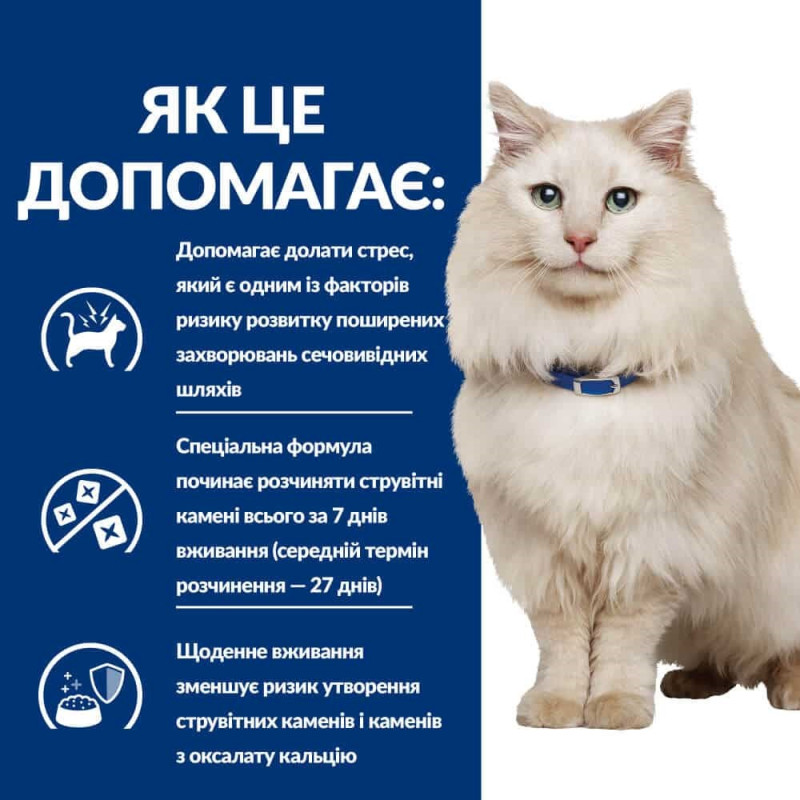 Сухий корм для котів Hill's Prescription Diet c/d Multicare Stress Urinary Care з куркою – повнораціонне дієтичне харчування, спеціально розроблене дієтологами і ветеринарними лікарями, щоб допомогти котам із захворюваннями нижніх відділів сечовивідних шляхів (ЗНВСШ), зокрема ІЦК. Переваги: • Спеціальна формула починає розчиняти струвітні камені вже за 7 днів споживання корму (середній термін розчинення складає 27 днів); • Містить L-триптофан і гідролізат молочного білка, що допомагають подолати стрес, який є значним фактором ризику виникнення ідіопатичного циститу котів; • Контрольований вміст кальцію, магнію та фосфору знижує концентрацію будівельних компонентів для кристалів і уролітів; • Калію цитрат пригнічує утворення кальцій-оксалатних кристалів і уролітів; • Омега 3 жирні кислоти (ЕПК і ДГК) переривають цикл запалення; • Комплекс антиоксидантів із клінічно підтвердженим ефектом нейтралізує дію вільних радикалів і підтримує імунну систему; • Підтримує оптимальну pH сечі** (6,2-6,4), перешкоджаючи утворенню струвітних і кальцій оксалатних кристалів і уролітів; • S+OXSHIELD: спеціальна формула сприяє оздоровленню сечової системи у тварин, завдяки чому зменшується ризик утворення струвітних і кальцій-оксалатних каменів; • Має відмінний смак, який кіт точно вподобає. Клінічно доведено: • Клінічно перевірене харчування, здатне зменшити частоту рецидивів ІЦК на 89 %, тепер також містить інгредієнти, які зменшують дію факторів стресу. • Клінічно доведено, що при споживанні цього харчування струвітні камені розчиняються вже за 7 днів (середній термін розчинення складає 27 днів). • Під час досліджень було виявлено, що харчування для котів Prescription Diet c/d Multicare Stress знижує ризик утворення струвітних і кальцій-оксалатних уролітів. • У ході дослідження власники домашніх тварин, що спостерігали за котами з явними ознаками ІЦК, повідомляли про підвищення в їхніх улюбленців інтересу до соціалізації після годування кормом Prescription Diet c/d Multicare Stress. Додаткова інформація: • Підходить для тривалого годування, ідеальний вибір для годування декількох котів, що живуть разом. • Сухі та вологі раціони можна змішувати та згодовувати одночасно. Показання: • усі випадки первинних ЗНВСШ (виявлених під час обстеження) • ідіопатичний цистит котів (ІЦК) • оксалатно-кальцієвий уролітіаз, зменшення частоти рецидивів • кальцієво-фосфатний уролітіаз, зменшення частоти рецидивів • струвітний уролітіаз, зменшення частоти рецидивів Інші показання: • розчинення струвітних каменів • захворювання серця легкої або помірної стадії, а також безсимптомні • тяжка серцева недостатність Протипоказання: • Для кошенят • Для кішок у період вагітності та лактації • Для тварин, яких паралельно лікують засобами, що підвищують кислотність сечі Рекомендована тривалість дієтотерапії: для зниження повторного утворення струвітних уролітів: спочатку до 6 місяців; для розчинення струвітних уролітів: 5-12 тижнів; для зниження формування оксалатних уролітів: до 6 місяців. Перш ніж використовувати корм, попросіть вашого ветеринарного лікаря надати конкретні рекомендації з годування вашого улюбленця. Придбали цей корм уперше? Змішуйте старий і новий корм вашого улюбленця, поступово зменшуючи кількість старого та збільшуючи кількість нового протягом щонайменше 7 днів. Детальні рекомендації щодо г