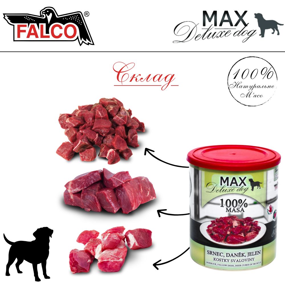 Склад консервованого м'яса для собак Олень, Козуля, Лань MAX Deluxe Dog 100%