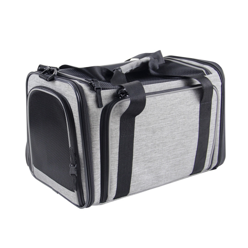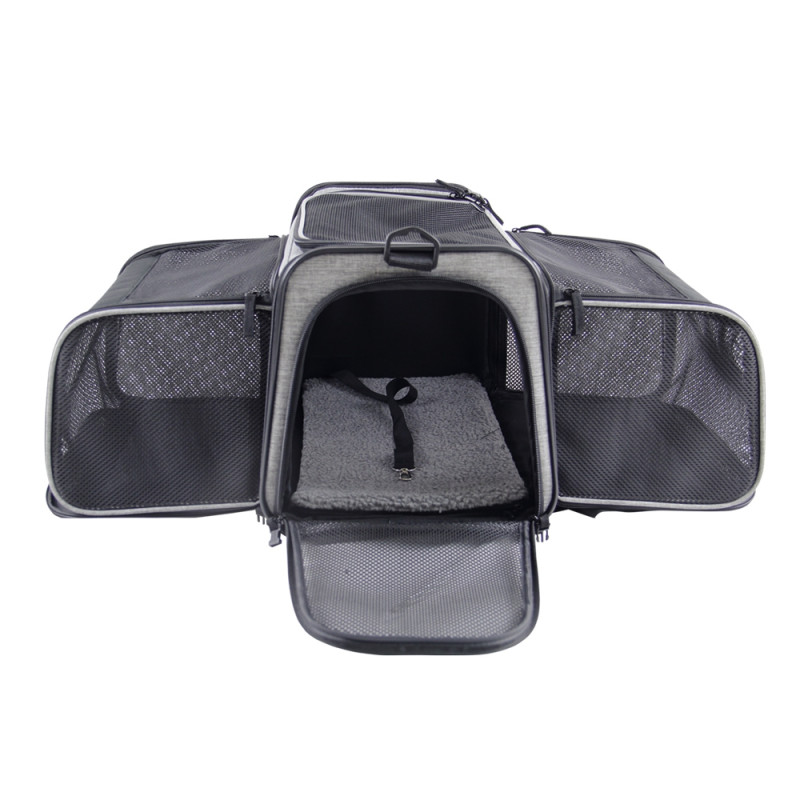 Вона виготовлена зі зносостійкої мікрофібри та оснащена відстібним дном, що гарантує легкість у догляді за виробом. Внутрішній карабін для прив’язки гарантує додаткову безпеку тварини. Постійний приплив свіжого повітря і хорошу циркуляцію забезпечують дві сітчасті вставки. Крім того, сумку можна перетворити на зручний будинок різного об’єму завдяки відкидним бічним панелям з сітчастої тканини. Двосторонній килимок з плюшевим чохлом забезпечить додаткове тепло у будиночку.