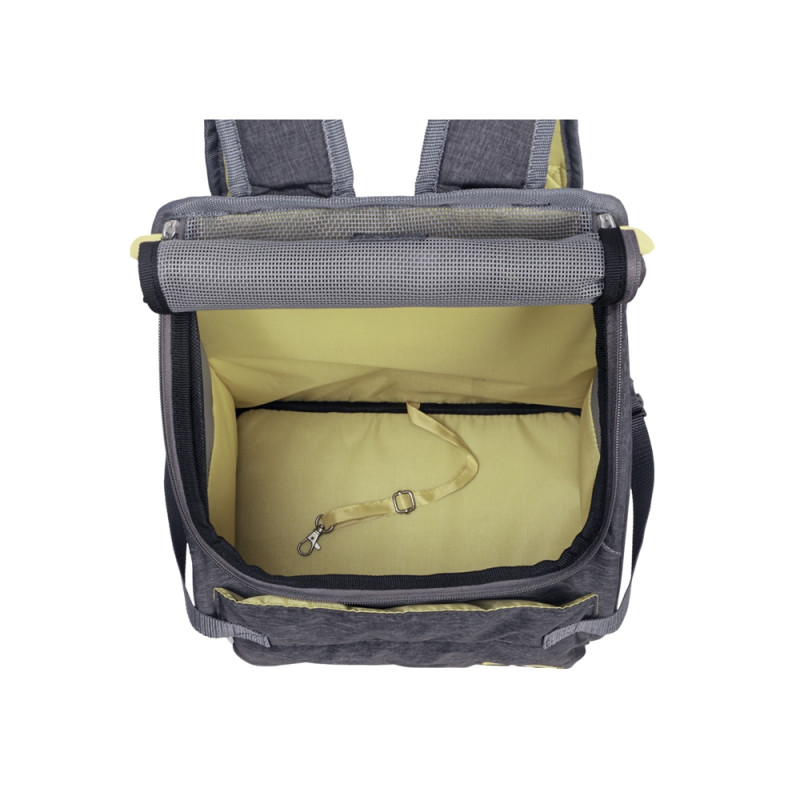 Постійний приплив свіжого повітря і хорошу циркуляцію забезпечують три сітчасті вставки, одну з яких можна повністю відкрити, перетворюючи рюкзак на «кенгуру» -карман, який дозволяє улюбленцю спостерігати за навколишнім середовищем. Рюкзак оснащений великим відділенням для ласощів, посуду або аксесуарів вихованця.