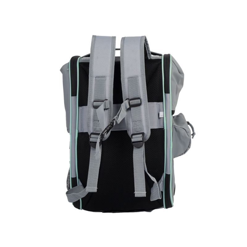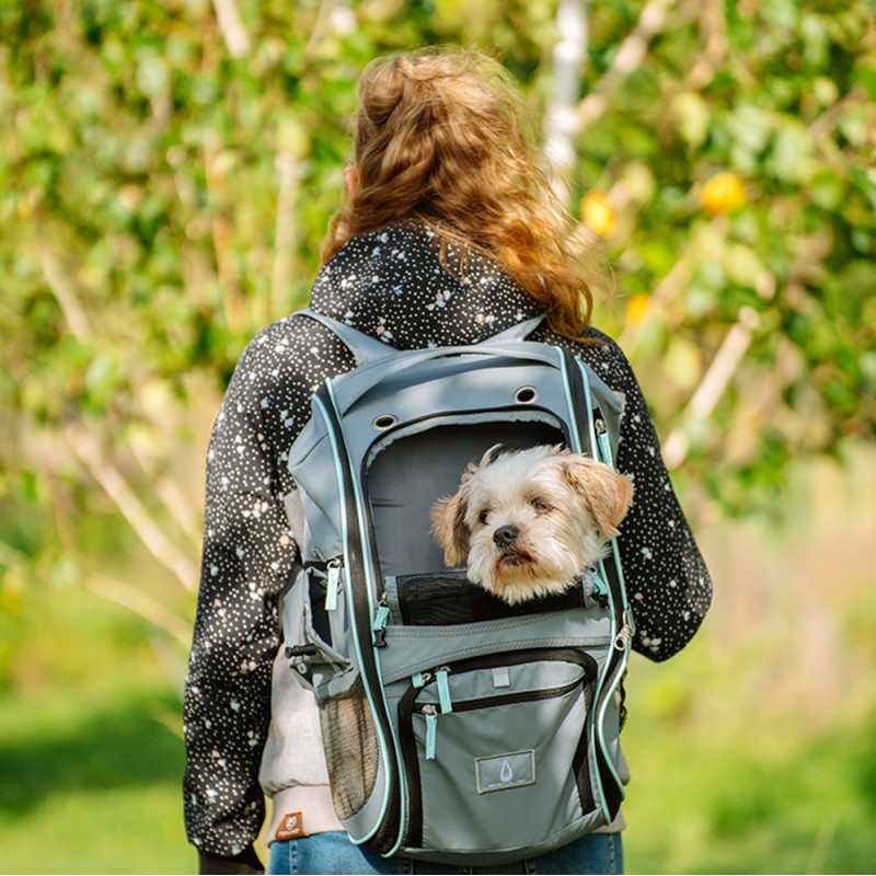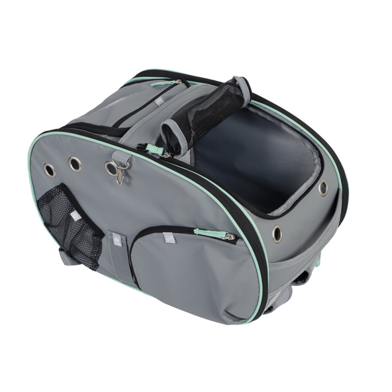 Рюкзак виготовлений зі зносостійкої мікрофібри та має посилене дно із захисним чохлом. Переноску можна носити у руках або на спині завдяки м’яким лямкам, поясному ремінцю та ортопедичній укріпленій спинці . Додаткові петлі для кріплення до автокрісла забезпечують безпеку під час подорожей автомобілем. Внутрішній карабін для прив’язки гарантує додаткову безпеку тварини. Постійний приплив свіжого повітря і хорошу циркуляцію забезпечують численні сітчасті вставки, деякі з котрих можна повністю відкрити, щоб улюбленець спостерігав за навколишнім середовищем. При трансформуванні рюкзака у сумку, зручна бокова стінка на застібці-блискавці дозволяє легко перетворити переноску на зручний будиночок. Рюкзак оснащений 5 великими відділеннями під посуд та аксесуари улюбленця, які надійно закриваються, щоб їжа залишалась свіжою у будь-яку погоду.